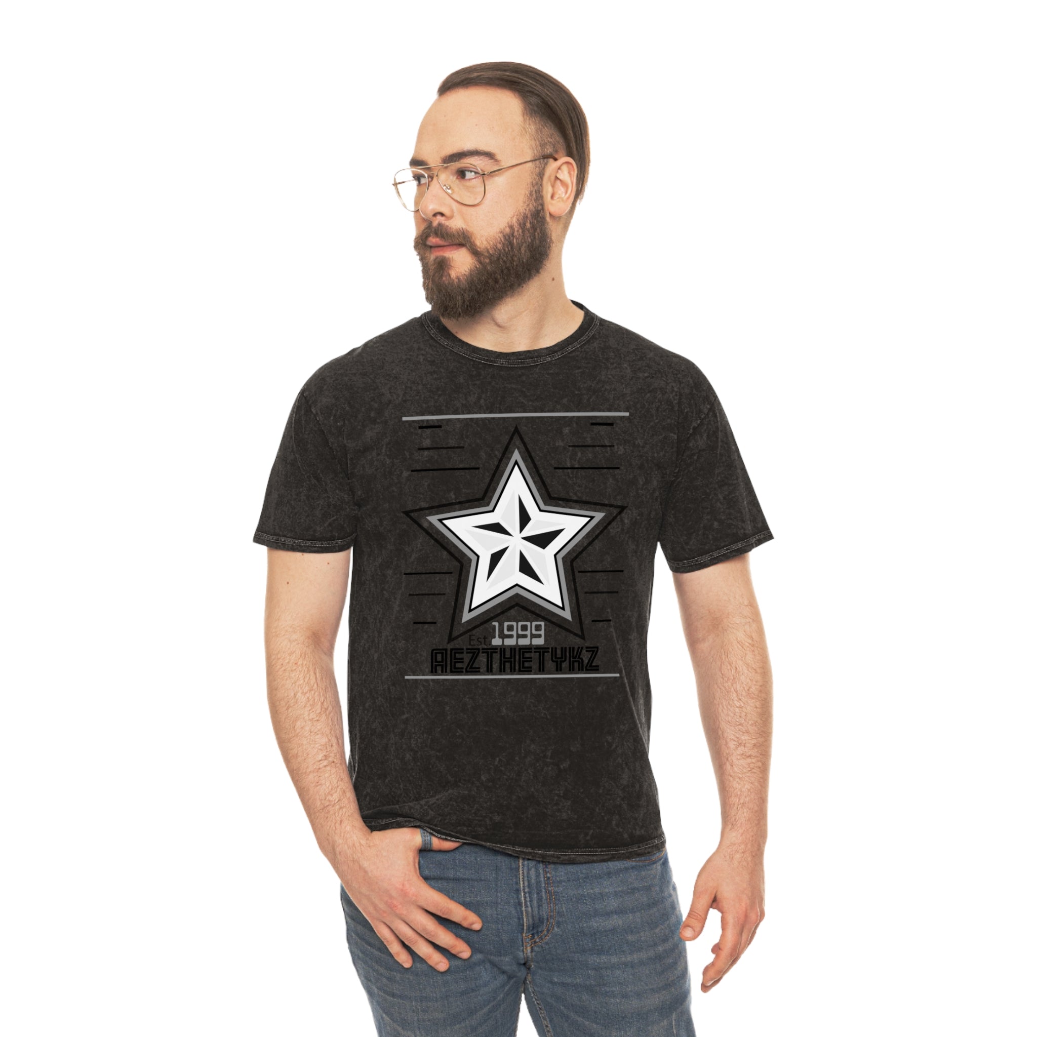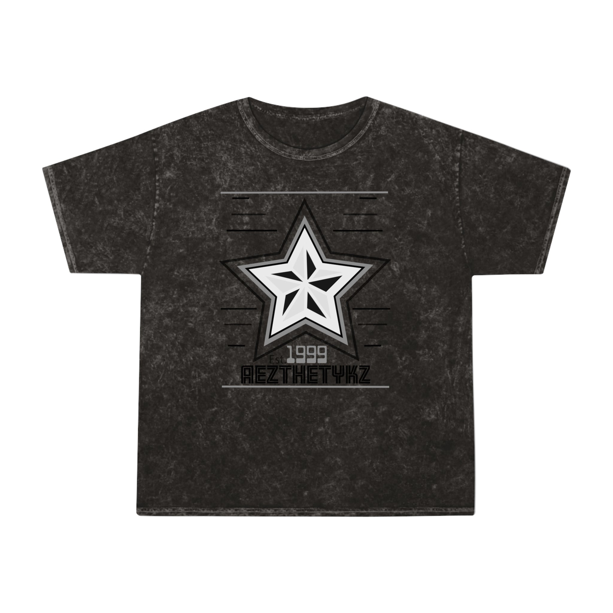 Made famous in the 80s by the underground music scene, the mineral wash tee is now making its return, big time. The 100% soft, heavyweight cotton construction and the seamless, double-needle crew collar give this tee a superior feeling of comfort and an impressive durability factor. Each AEZTHETYKZ-1999 Logo mineral wash tee is hand-dyed with superior colorfastness for great looks that are long-lasting.