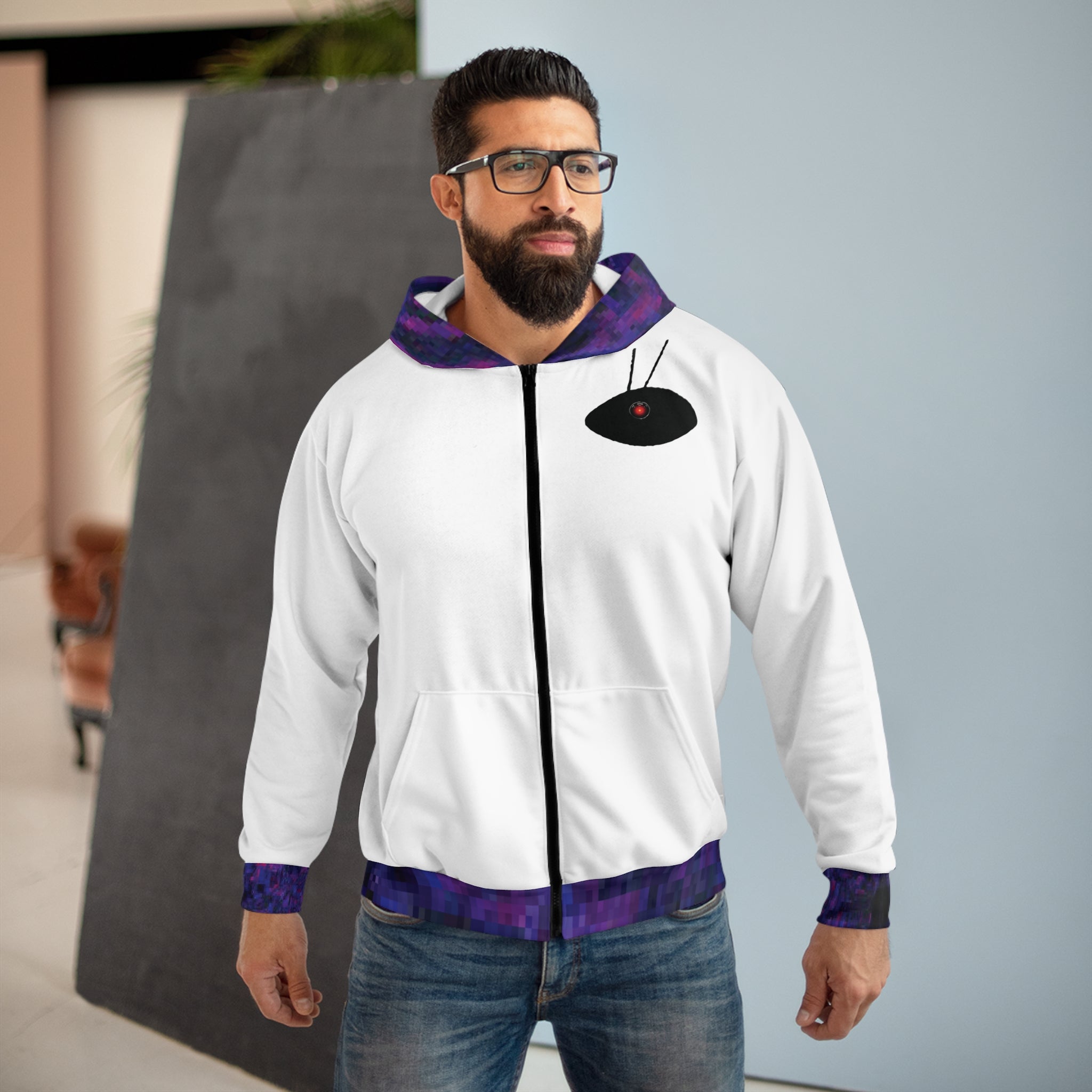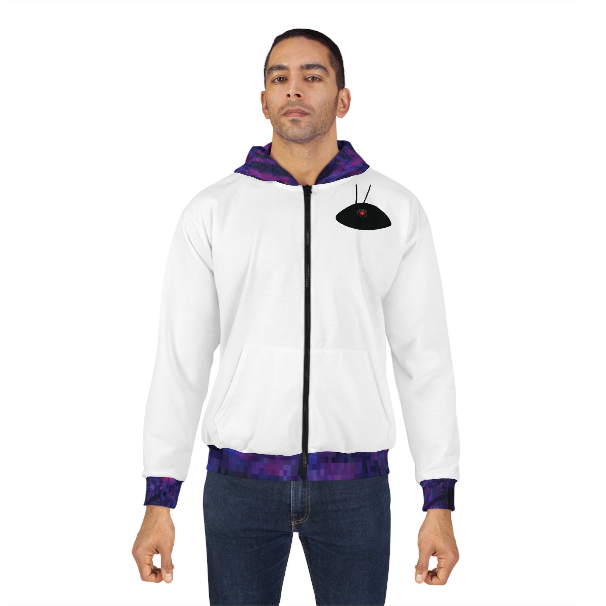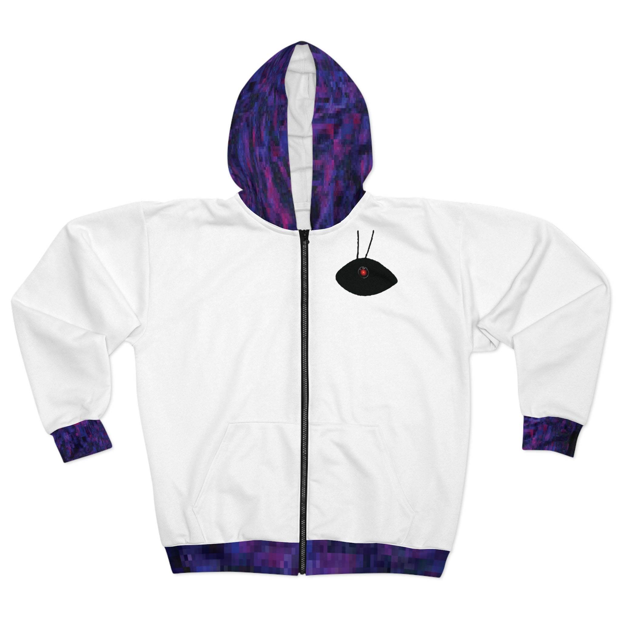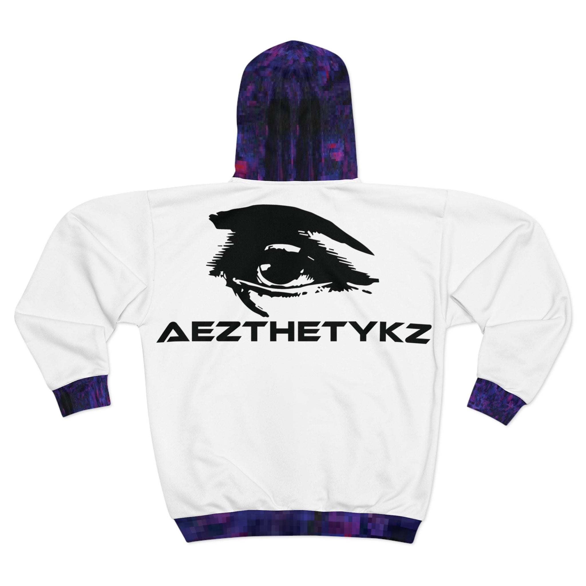 This AEZTHETYKZ Printed Zipped fleece jacket will keep you nice. It has a large front pocket, black zipper, a roomy hood and is custom cut and sewn.