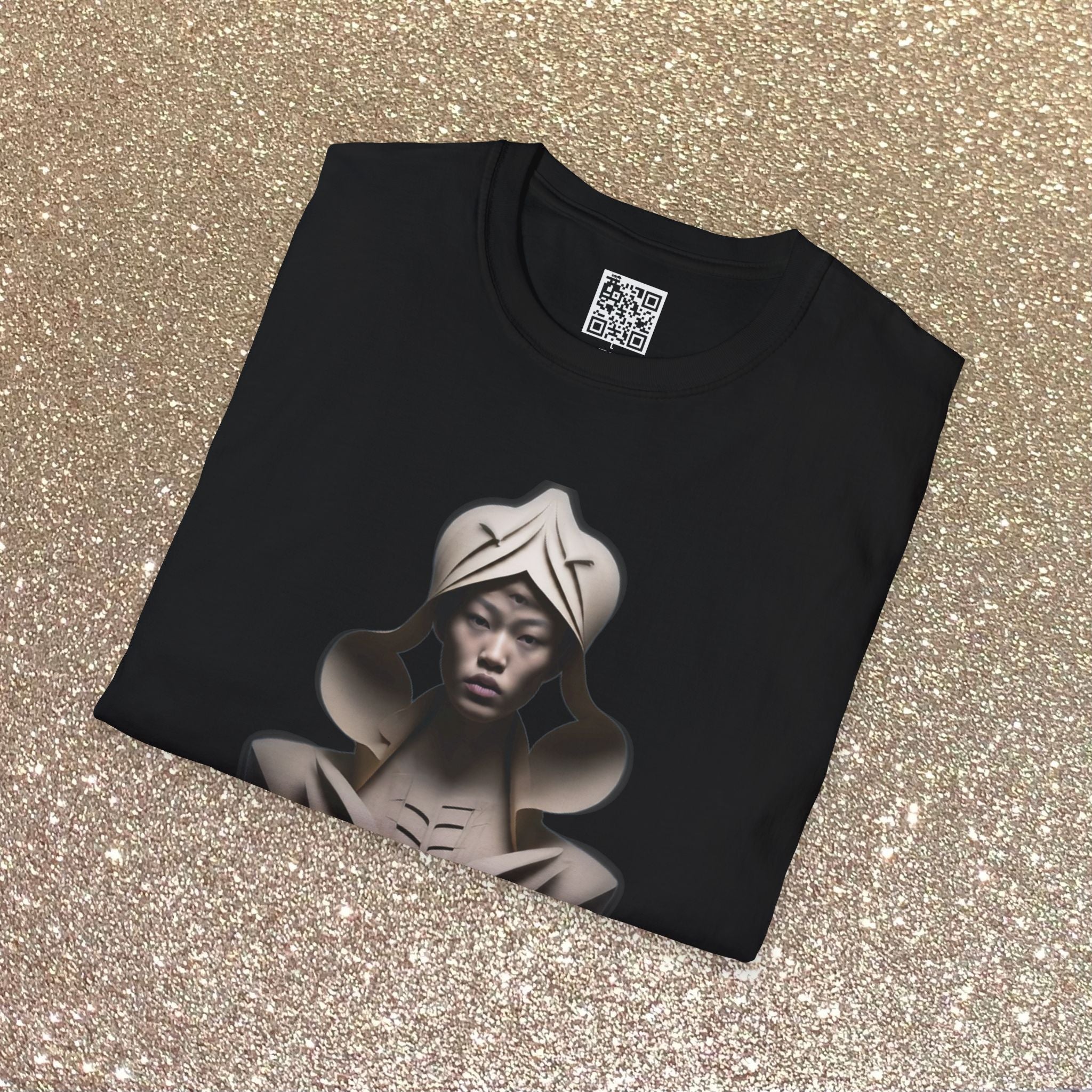 - DTG/DTF-printed Origami artwork with pearlized, tear-away inner label for comfort