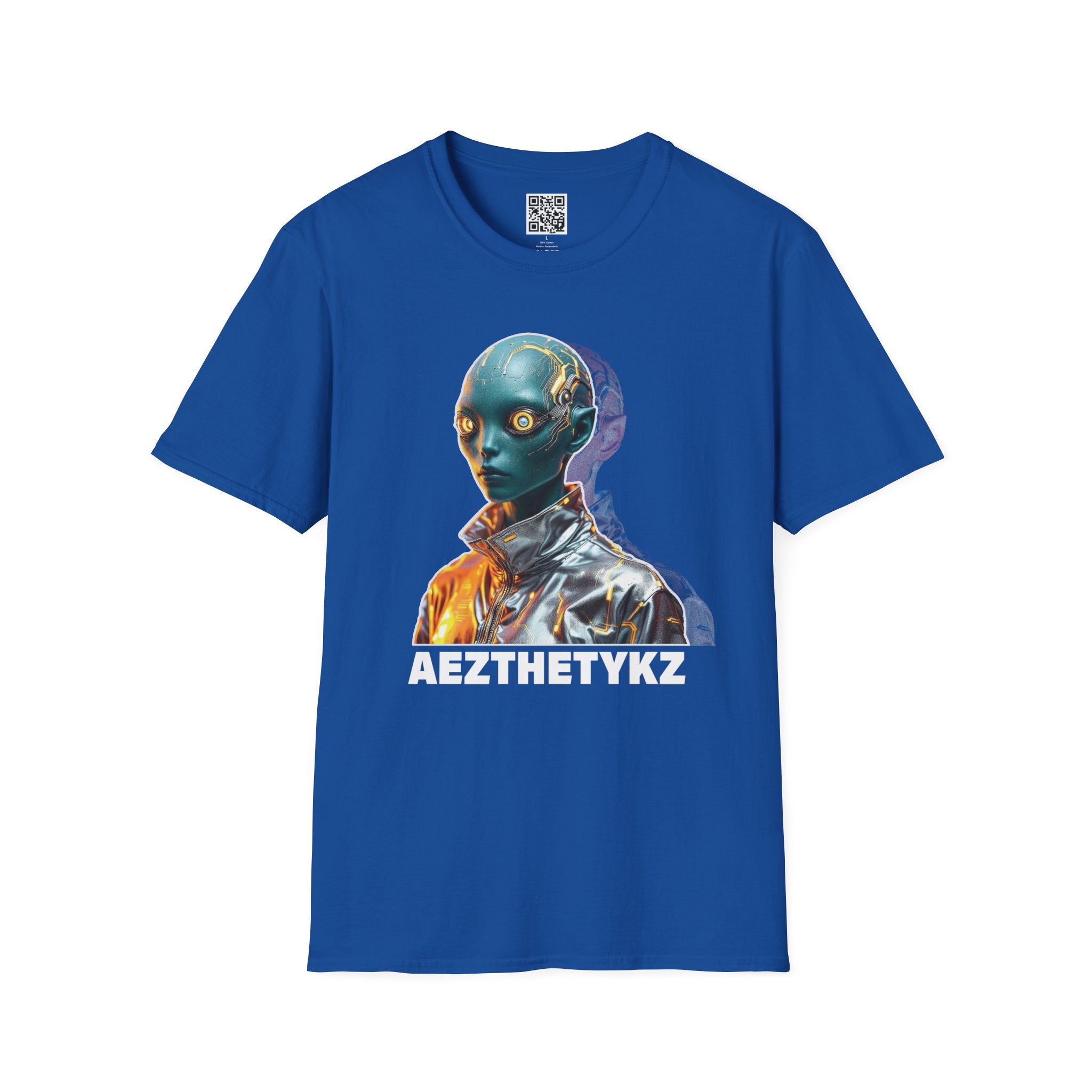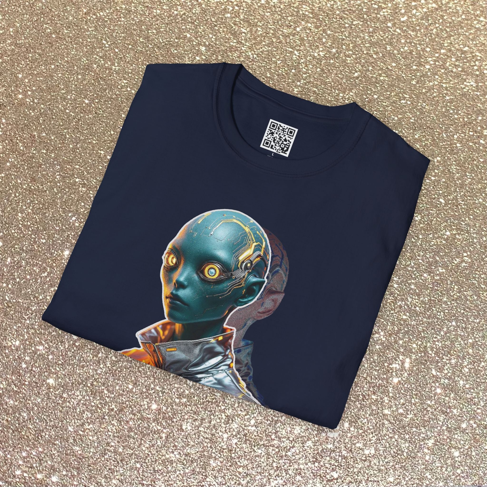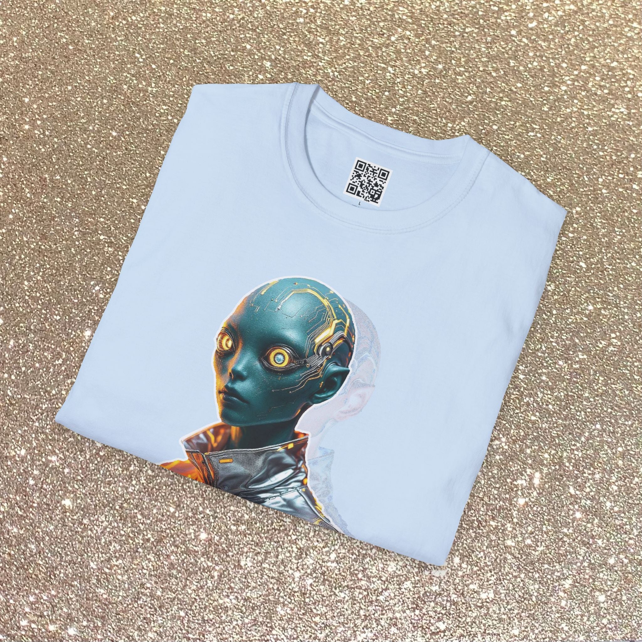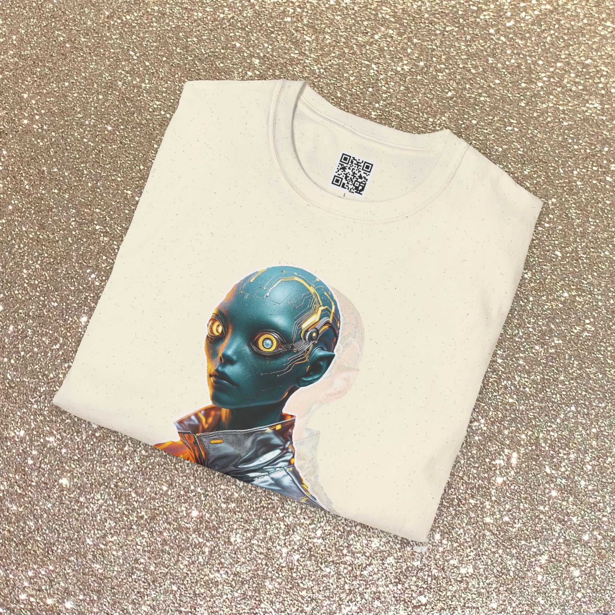 A lightweight, breathable tee that carries a quiet sci-fi edge. Printed on smooth, ring-spun cotton, the shirt showcases a striking G-ed Up metallic-alien portrait with reflective color shifts that catch the eye without shouting. Wear it layered under a jacket or alone; the classic crew cut and clean lines keep the image front-and-center while the soft fabric moves with you. It feels lived-in from the first wear and holds shape wash after wash thanks to reinforced collar and shoulder details. For someone who collects visual oddities, nights at gallery openings, or late-night synth playlists, this tee turns a simple outfit into a statement — cinematic, curious, and a little otherworldly.